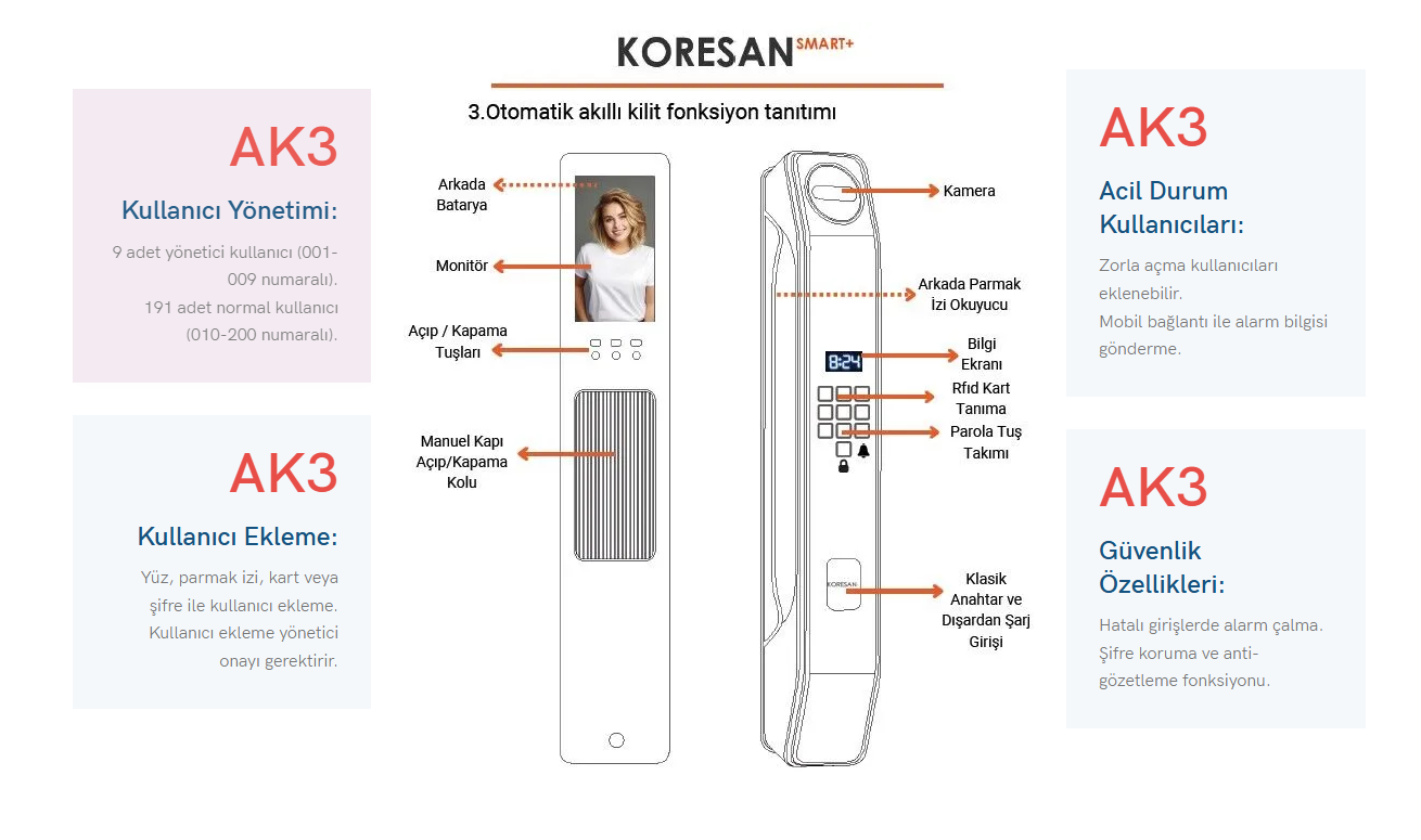 AK3 modeli, HD çözünürlüklü 4.5 inç ekran ve entegre kamera ile kapınızın önündeki kişiyi net bir şekilde görmenizi sağlar. Görsel interkom ve iki yönlü konuşma özelliği sayesinde ziyaretçilerinizle anında iletişim kurabilirsiniz. İnsan algılama sensörü, kapınızın önünde hareket algıladığında otomatik olarak görüntü kaydı başlatır ve istenirse alarm sistemini devreye sokar.
