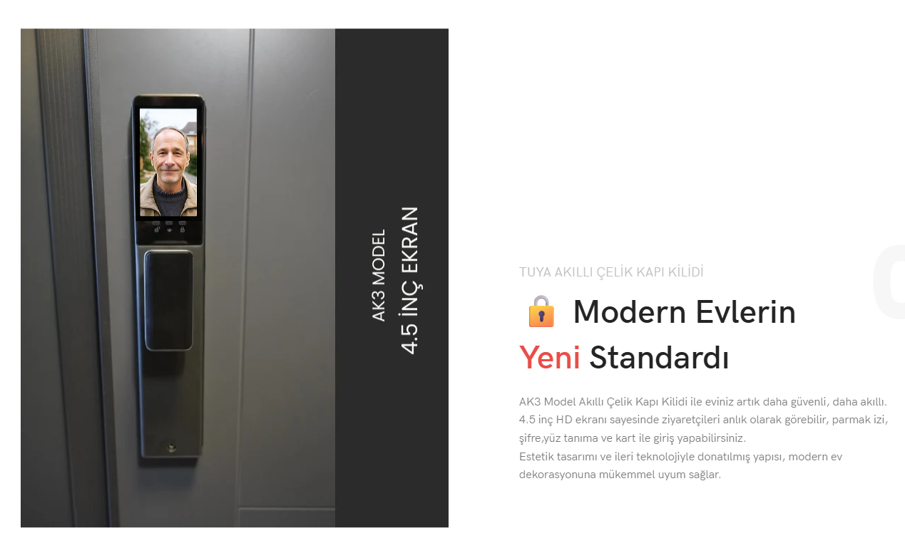 AK3 Tuya Akıllı Kapı Kilidi, modern yaşam alanları için tasarlanmış yüksek güvenlikli bir giriş çözümüdür. Evlerde, ofislerde ve ticari alanlarda güvenliği üst seviyeye taşır. Şık ve sağlam tasarımıyla kapınıza estetik katar, gelişmiş teknolojisiyle güvenliği konforla birleştirir.