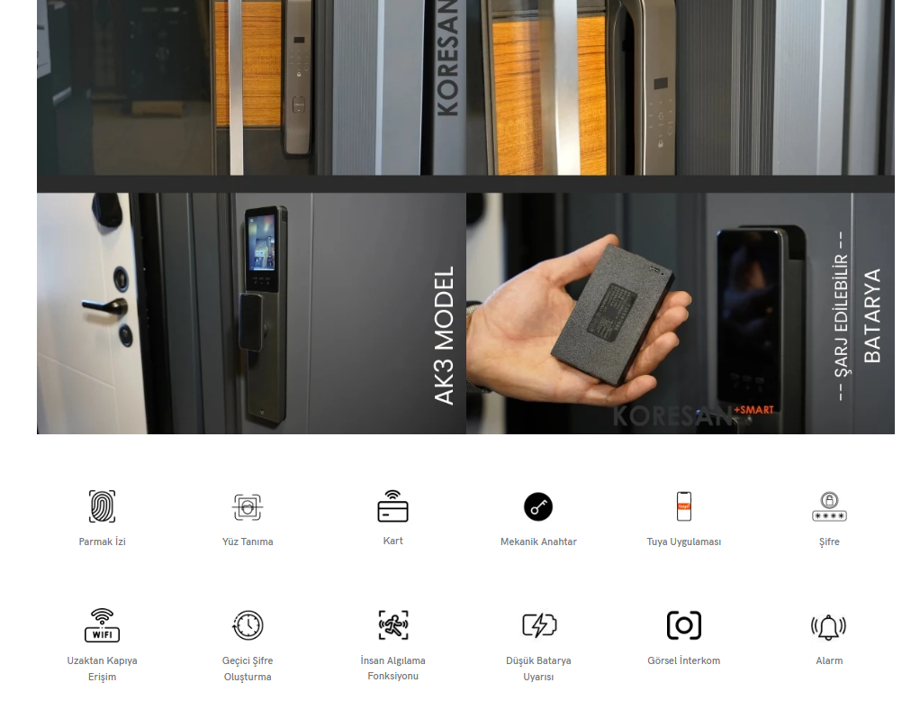 6 farklı kilit açma yöntemi: Yüz tanıma, parmak izi, şifre, RFID kart, mekanik anahtar, mobil uygulama