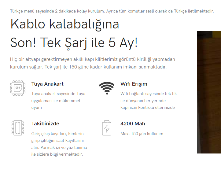 Kurulumu son derece kolaydır. Türkiye’deki çelik kapıların %99,9’u ile uyumlu yapısı sayesinde ek tadilat gerektirmez. Kablo karmaşası yaratmadan, görüntü kirliliği oluşturmadan montaj yapılabilir. Türkçe menü ve sesli komut desteği, teknolojiyi herkes için erişilebilir kılar.