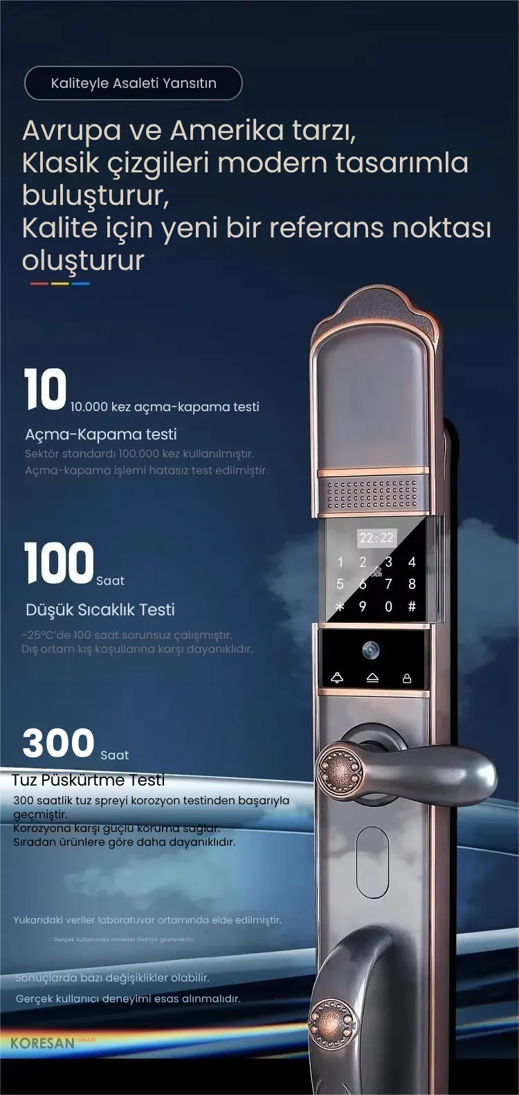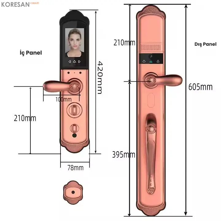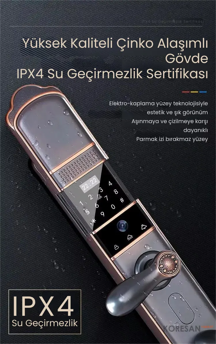 Villa ve yüksek güvenlik gerektiren evler için özel olarak tasarlanmış bir akıllı kapı kilididir. Yüz tanıma, parmak izi, şifre, kart ve mobil uygulama ile kontrol edilebilir. 4200 mAh lityum pil ile 5–8 ay kullanım sağlar ve IPX4 su geçirmezlik sertifikasına sahiptir.