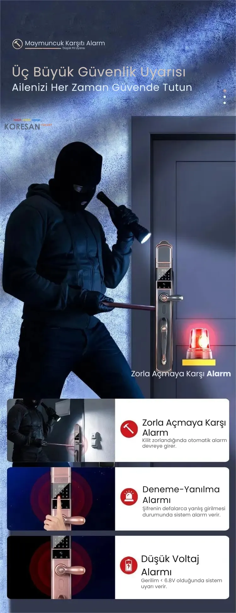 ⚠️ Darbe, düşük pil ve şifre deneme hatası durumlarında akıllı alarm sistemi